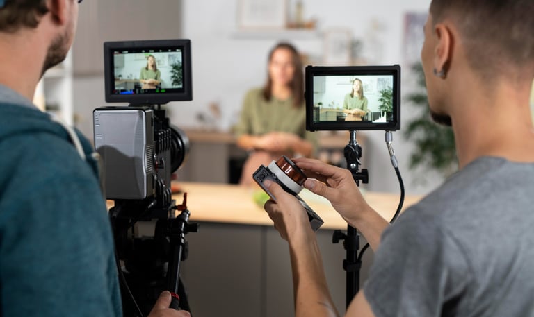 Conteúdo criado usando elementos visuais como comerciais de TV, vídeos promocionais, de rede sociais e banners animados.
